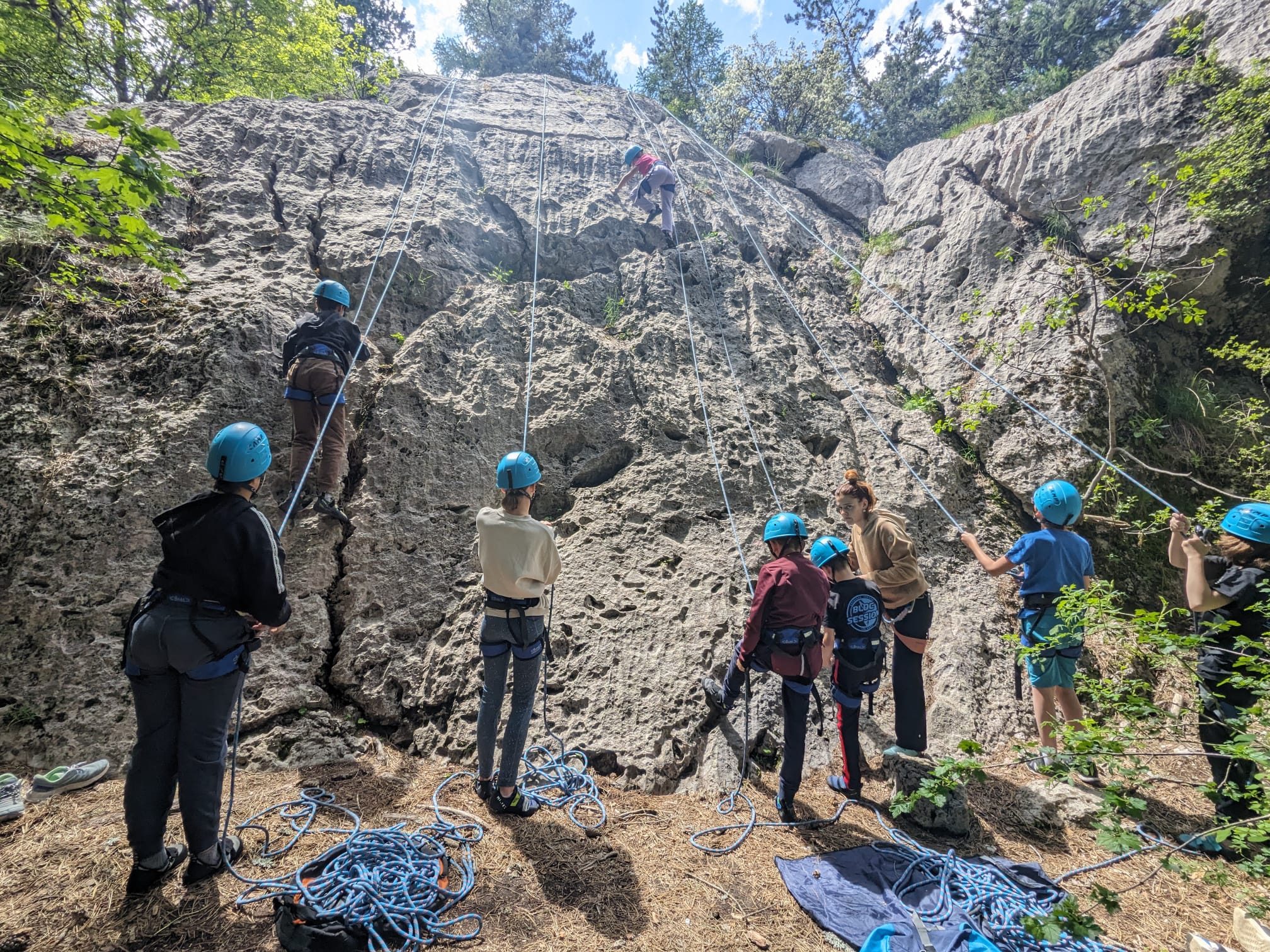 C’est le grand jour ! Les jeunes feront leurs premiers pas en falaise école sur des voies de 10 à 30 mètres et feront en toute sécurité le plein de sensations. Les sites que nous choisissons sont à l’ombre en plein été et au soleil en hiver 😉